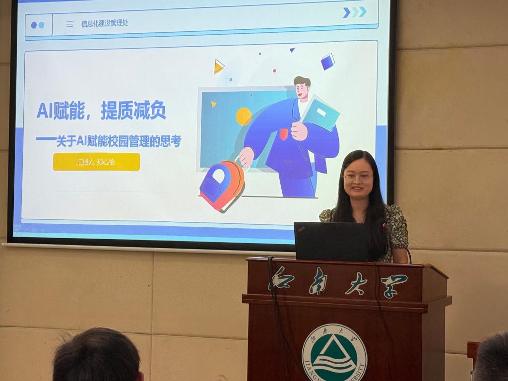 随后,信息化处孙心怡以“AI赋能 提质减负——关于AI赋能校园管理的思考”为主题,由人工智能发展脉络切入,从AI技术的应用背景、核心场景、案例分享、未来展望以及个人感想等五个方面层层开展讲解。内容紧密结合我校教育教学、科学研究等管理实际,以生动的案例展示了AI在优化流程、辅助决策等方面的巨大潜力,为管理干部认识理解AI技术,探索AI技术与管理服务的融合路径提供了清晰而有启发性的思路。